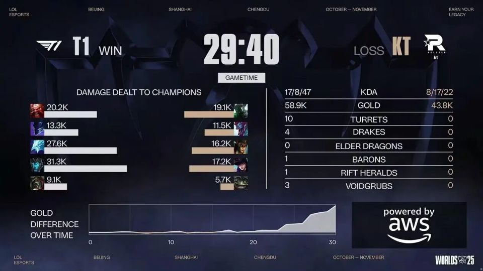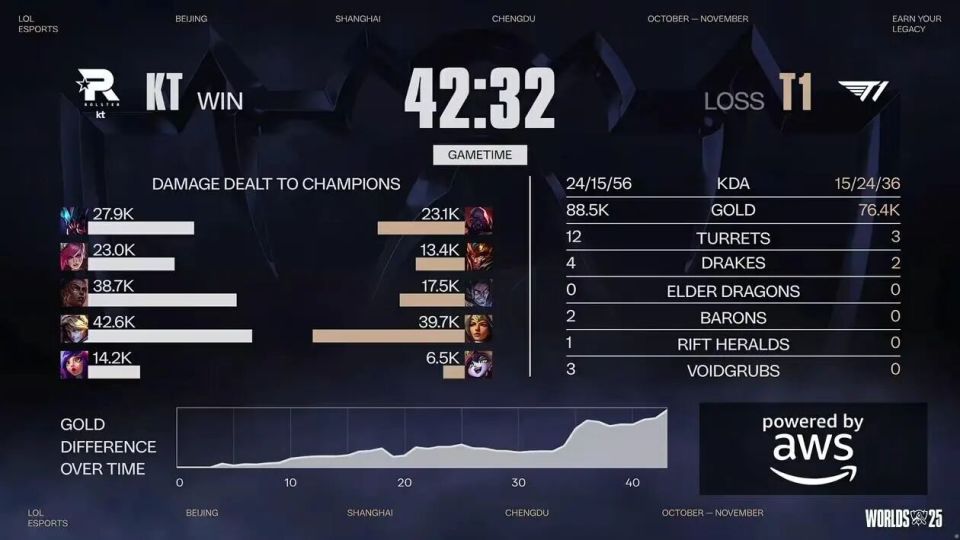 决胜局战况异常焦灼,前期kt人头数领先,经济更好;而T1则拿到了大量中立资源,手握多条小龙。这种微妙的平衡,被T1在小龙的一场完美团战给打破了。至此,kt再也无法阻挡他们的攻势,T1成功扳回一分,将比赛拖入最后的决胜局。