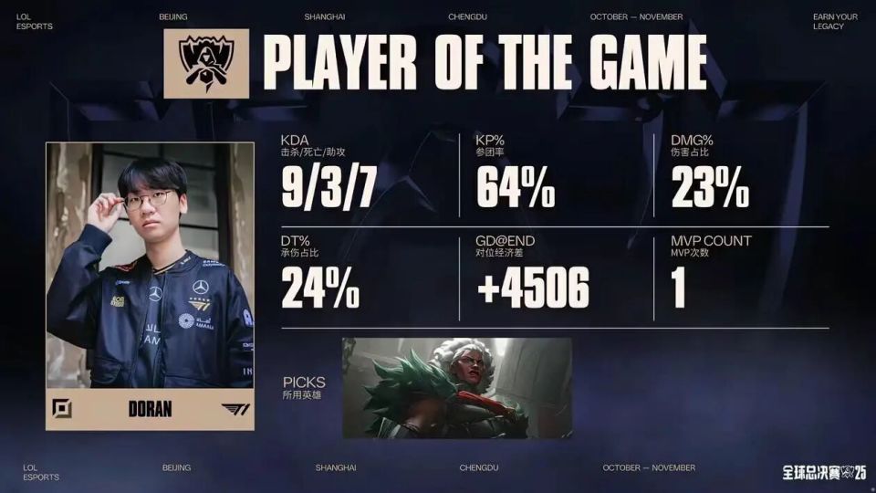 其中发挥最亮眼,无疑是AD位的“Doggo”选手。他在这次世界赛上仿佛迎来了进化,一手德莱文力克T1,一斧头一斧头地带领队伍砍进世界赛。