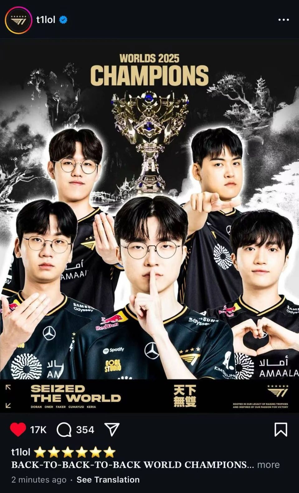 随着基地水晶的爆炸,现场响起了震耳欲聋的欢呼声,而在鏖战多局之后,T1将2025年英雄联盟世界总决赛的比分定格在了3:2,由他们捧起了今年S赛的奖杯。