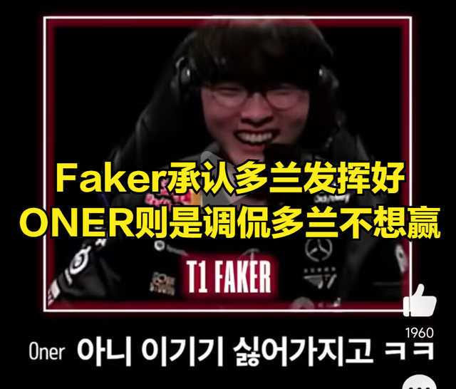 而Faker也在赛后采访当中,也是回应多兰在比赛当中多次出现失误的问题,Faker表示多兰虽然比赛状态起伏严重,但是多兰在比赛期间还是很好的发挥自身作用,相比于多兰的失误,多兰其他方面的发挥都非常完美,虽然Faker在赛后采访期间称赞多兰,但是T1打野ONER可没有Faker这么多脑筋,直接在比赛语音当中调侃多兰“是不是不想赢拿世界冠军”。
