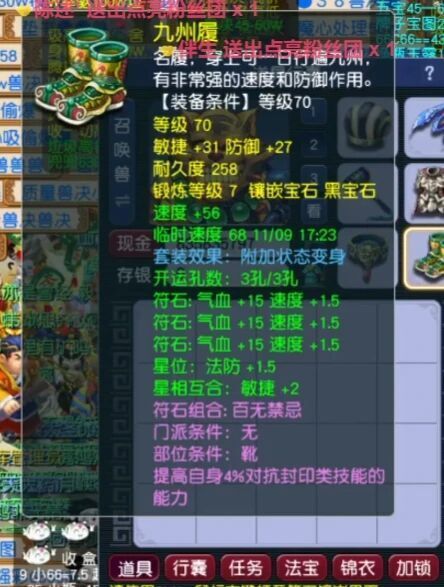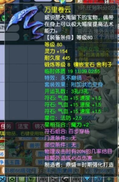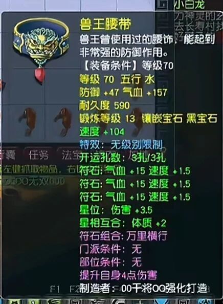 70级的无级别腰带,气血+157,防御+47,打了13段黑宝石!