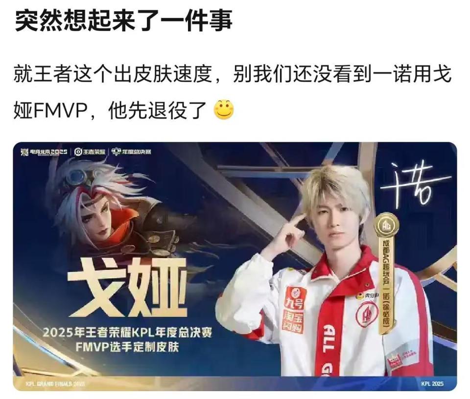 如此说来,其实很多网友会担心“一诺退役前戈娅FMVP皮肤能不能上架”也有道理,毕竟要知道,电子竞技真的很吃青春,一诺是01年的,现在已经24,按照一年多时间来算,戈娅皮肤上线得到他26岁,这……