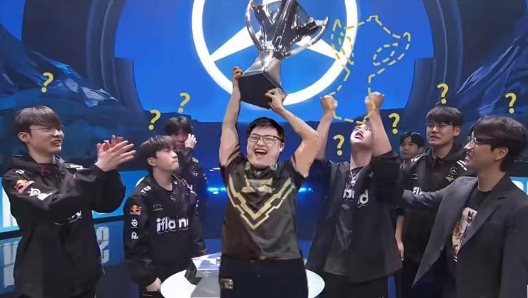 当然了,就在T1夺冠之后,在颁奖环节,出现了离谱一幕。想必观众们都有看到吧,来自LPL赛区的传奇AD选手Uzi简自豪,出现在了颁奖台上面。没错,今年是在国内举办的世界赛,所以作为东道主,选择了Uzi给FMVP选手进行颁奖。而最终,Uzi将FMVP奖杯颁给了gumayusi,同样作为ADC位置,Uzi将FMVP奖杯给到姑妈,还是很符合的。但是呢,有不少观众都在吐槽,为什么是0冠王给6冠王颁奖呢?
