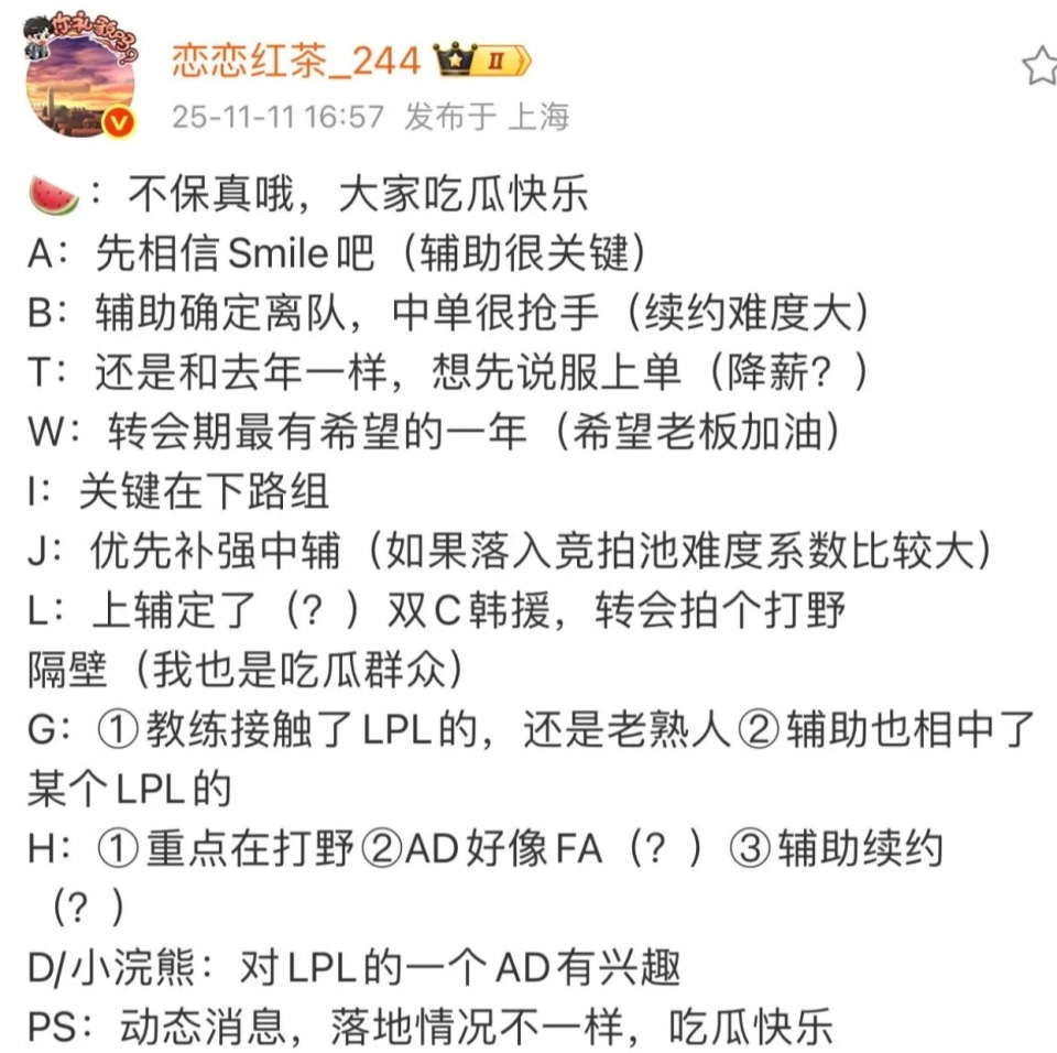 与此同时红茶还给出了另外一个爆料,就是中单位置的Knight转会期非常抢手,这一点大家都能预测得到,目前趋势来看Knight留队可能性很小。