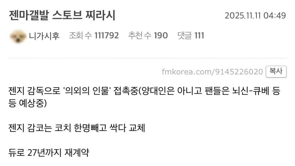 近日韩网论坛有人发帖称:GEN可能有个大新闻,17号要公布两人离队,一个是解约,另一个是不续约,评论区里,有人猜测不续约的是Kiin,因为GEN没抢到卡尔后,就已经有Duro续约的消息传出来了,中下双C都是签到27年,而且离队概率很低,那么解约的就只剩下上野两兄弟了。