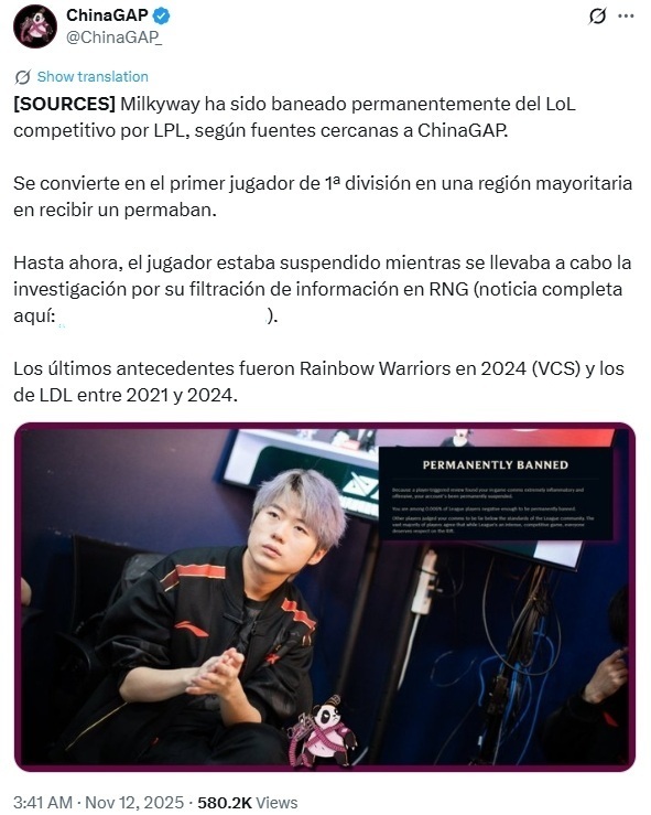 外媒爆料的消息如下,表示:milkyway成为首位在主要赛区被永久禁赛的选手。因为他在效力于RNG的时候,贩卖了德杯BP,FPX已经上报联盟调查,并且暂停了和milkyway的合作。不过在调查期间,milkyway表示自己没有任何违规行为,并且表示已经报案。
