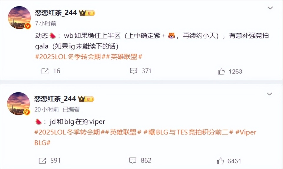 除了milkyway之外,也有不少转会期的瓜爆出,比如说知名爆料人恋恋红茶透露:JDG和BLG在抢Viper,WBG上单确定Zika,中单确定小虎,如果Tian再续约,WBG会去竞拍GALA,当然前提是GALA不和IG续约。
