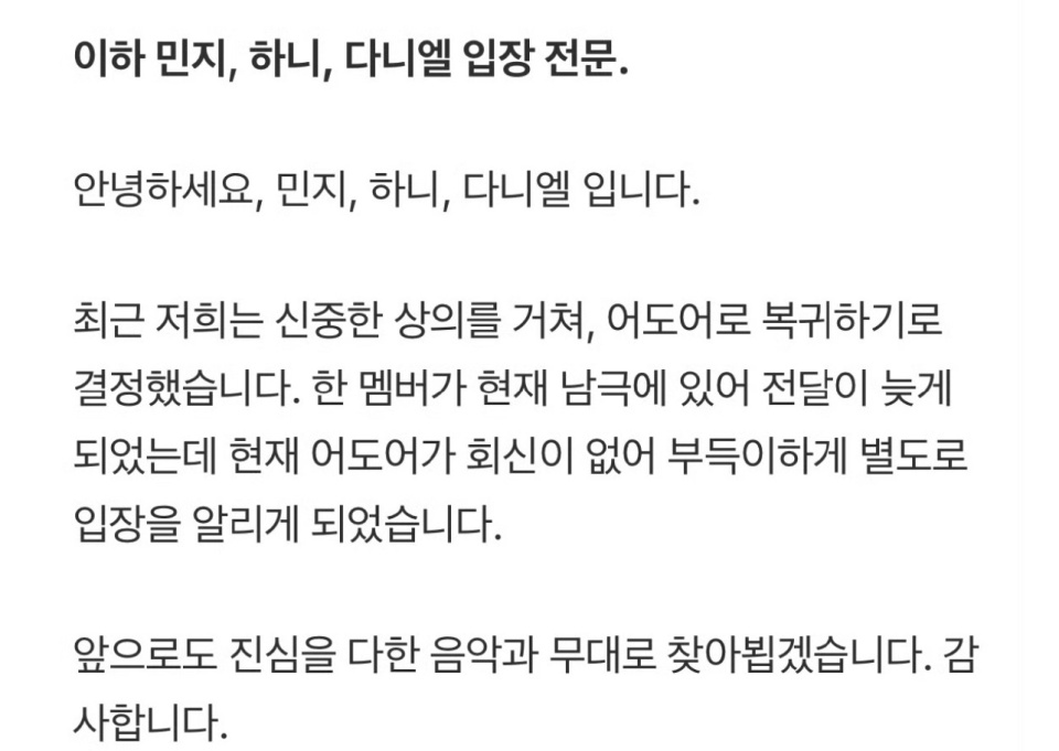 最近,我们经过慎重商议,决定回归ADOR。由于有一位成员目前仍在南极,消息传达有所延迟,与此同时,ADOR方面也尚未给予回复,因此才决定以单独声明的形式向大家传达这一消息。