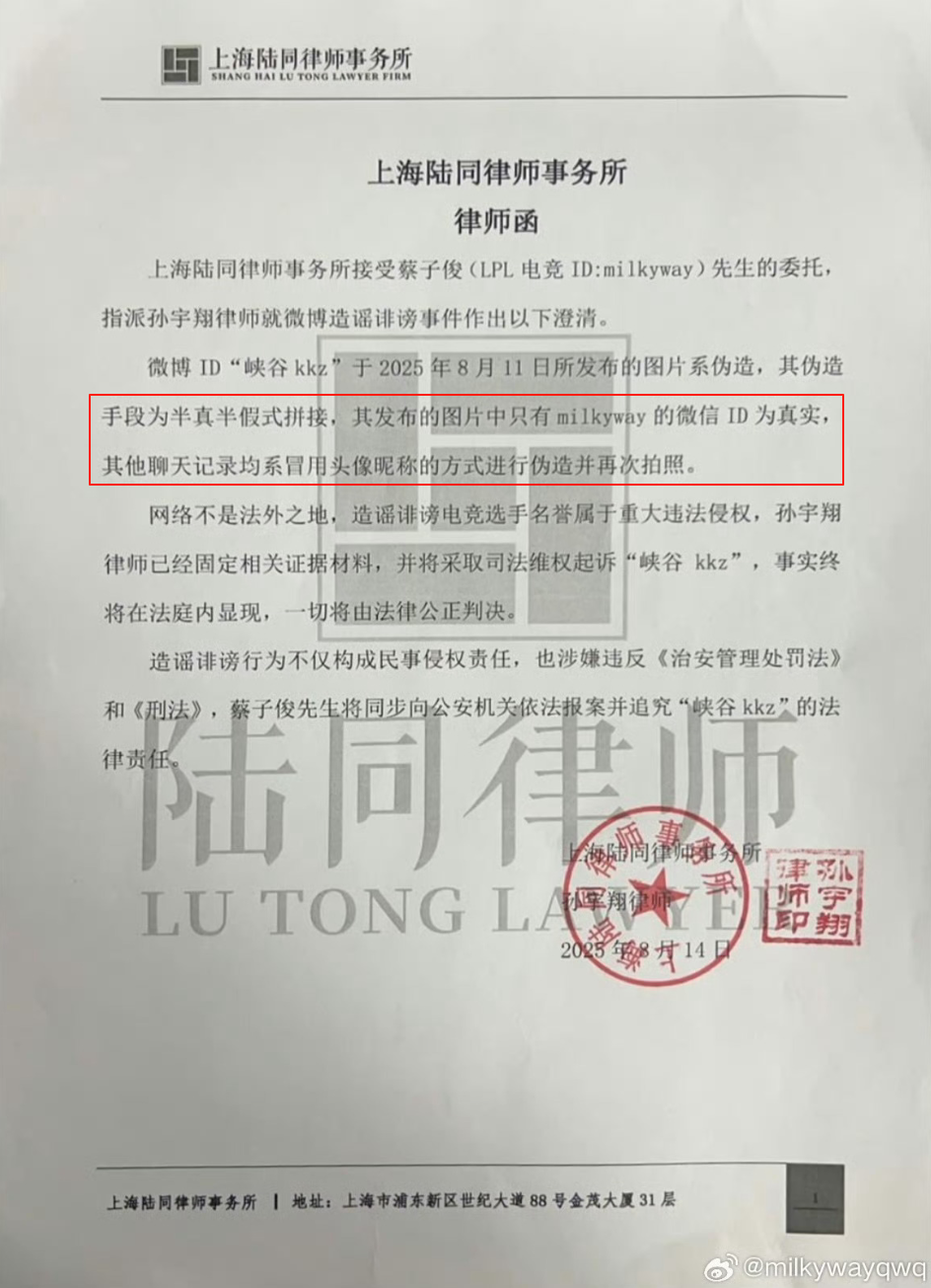 不知大家是否还记得Milkyway这名选手,曾经的天才超级新人,24年的春季赛+夏季赛+年度最佳新秀,如今为何销声匿迹了呢?今年8月,有网友举报FPX打野选手Milkyway在效力RNG期间,卖BP赚钱。这是违规行为,FPX立刻上报联盟,虽然还在调查中,不知道举报内容是否属实,FPX还是暂停了和Milkyway的合作,把Milkyway移出了比赛大名单。Milkyway很刚,发文称所谓的爆料是造谣,已经委托律师,要报警追究造谣者的法律责任。Milkyway表示,爆料图片是伪造拼接,微信ID是真实的,但聊天记录是伪造的。