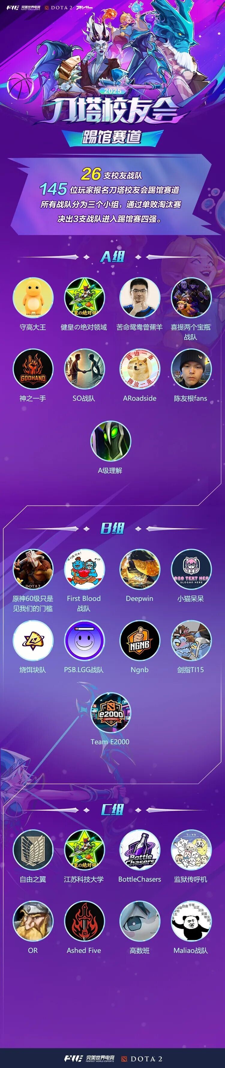 此外,刀塔校友会海选赛道报名已结束,26支校友战队和145位玩家报名参赛。海选赛也于明日开启,26支战队分三个小组,通过单败淘汰赛决出三支战队进入踢馆赛道四强赛,与Ori曾焦阳组建的战队争夺踢馆赛冠军,最终踢馆赛冠军将在完美世界电竞中心线下挑战主赛道冠军。