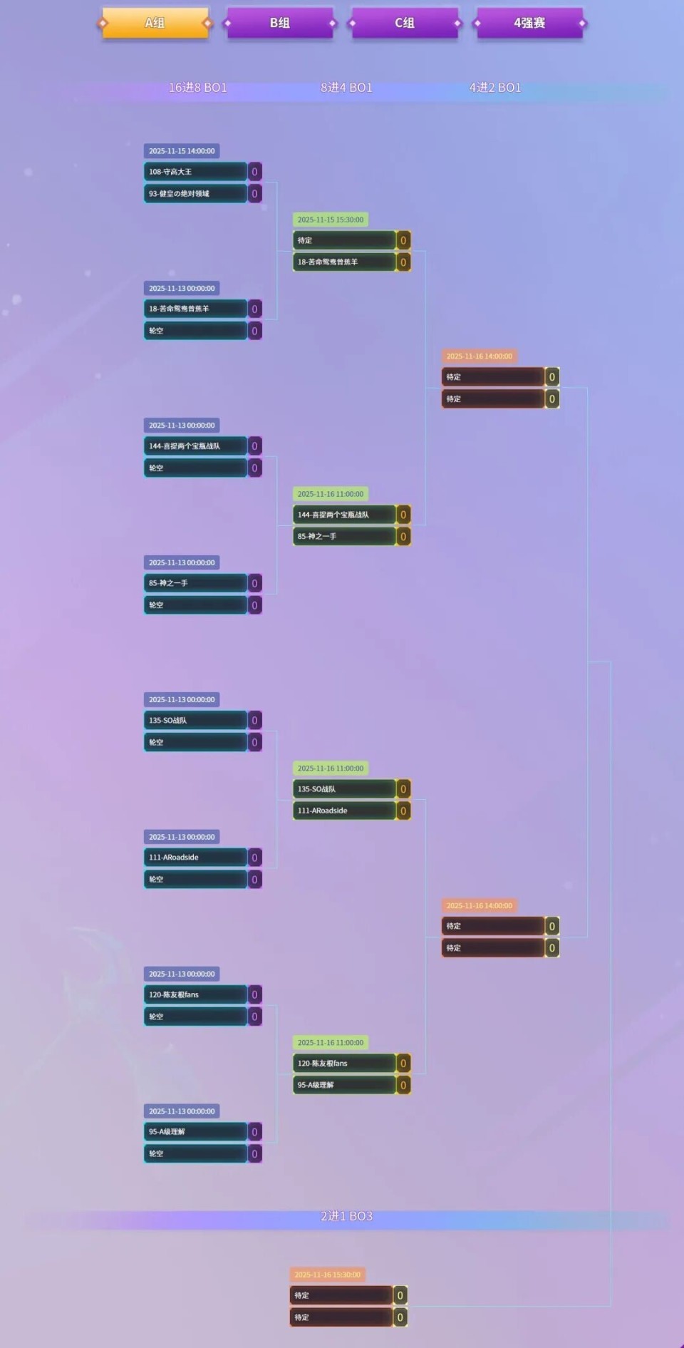 踢馆赛道的A组和B组各9支队伍,C组8支队伍,A组与B组海选11月15日开始,C组11月16日开始。每组的出线局为Bo3,其余场次为Bo1,非常考验队伍的临机应变。