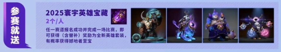 此次刀塔校友会奖励丰厚,报名成功并完成一场比赛就能获得2025寰宇宝藏2个,内含17套全新特殊主题英雄套装。