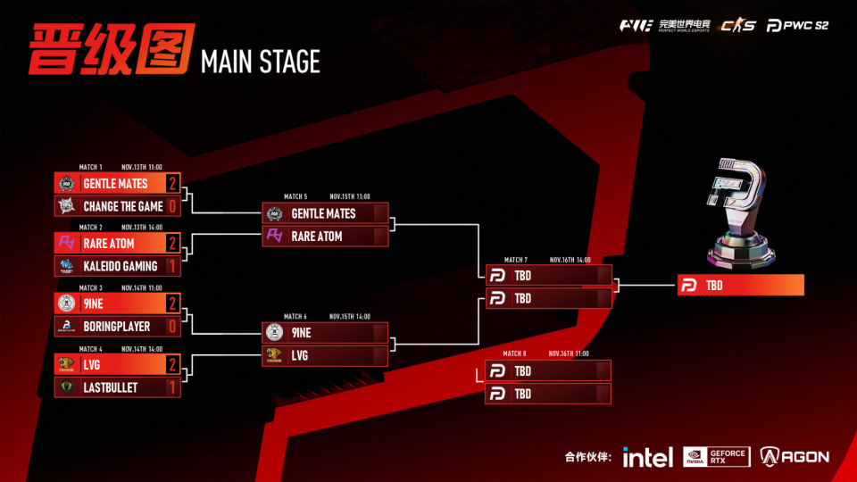 11月13日-16日,PWC S2正赛在上海进行最后决战。Gentle Mates、9INE、LVG、RA、Kaleido、Change The Game、Last Bullet和BORING PLAYER共8支战队,争夺35万总奖金和冠军荣誉。
