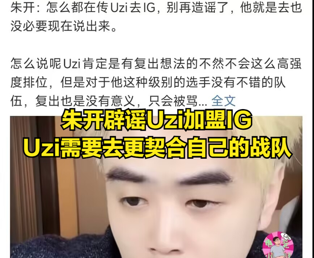 除了DOINB劝Uzi别复出之外,LPL冠军教练朱开也在直播期间泼冷水。朱开透露自己没有得到Uzi签约IG的消息,目前Uzi处于自由人,他在转会期能够自由加入任何战队,并且朱开表示Uzi复出面临的压力很大,所以不希望观众强迫Uzi加盟IG,Uzi复出的目的肯定是为了拿到世界冠军,所以Uzi需要找一个更契合自己的战队。(虽然朱开直播发言很“理中客”,但是很多观众也是猜测,AL可能也在争取Uzi,毕竟AL经理爱笑跟朱开关系很好,而且tabe也在直播当中喊话Uzi明年复出)