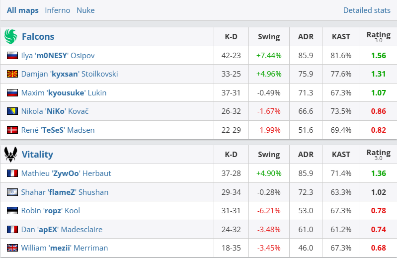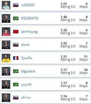 在决赛开始前,MVP的竞争已经逐渐明朗起来。从小组赛阶段开始,m0NESY就一直领跑榜单。而在半决赛结束之后,他依旧保持着1.51的超高rating。即使是队内数据第二好的kyousuke(1.14),也和他有着不小的差距。