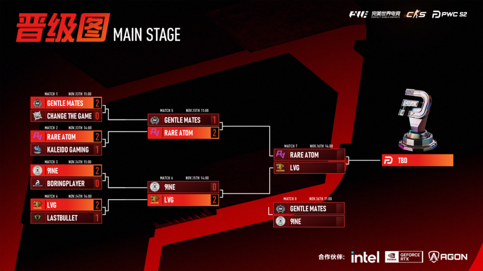 11月13日-16日,PWC S2正赛在上海进行最后决战。Gentle Mates、9INE、LVG、RA、Kaleido、Change The Game、Last Bullet和BORING PLAYER共8支战队,争夺35万总奖金和冠军荣誉。