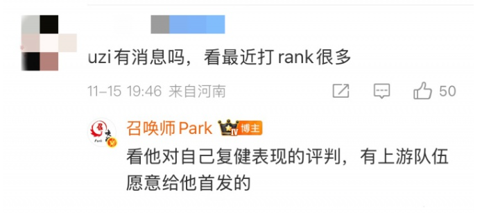 另一位知名爆料人召唤师Park也透露:有LPL上游队伍愿意给Uzi首发,但是需要看Uzi对自己复健表现的评判。
