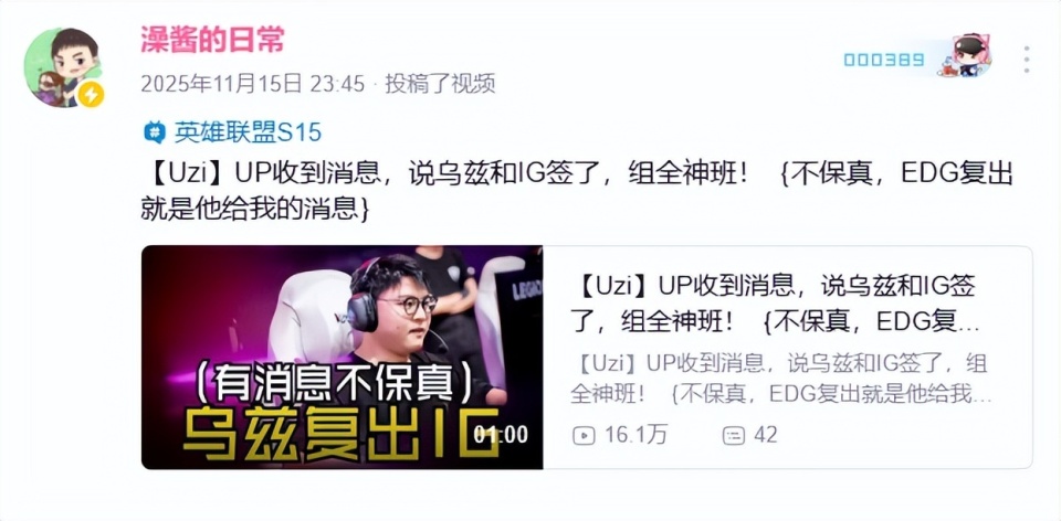 具体爆料消息如下图所示,Uzi知名大粉丝澡酱的日常在B站爆料,说自己收到了消息,Uzi和IG签了,组建全神班!不过他也补充表示:消息不保真,但是之前Uzi在EDG复出的消息,也是这个人给我的。