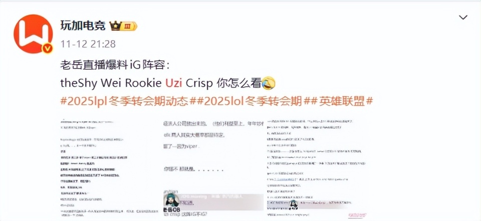 而最早的消息是EDG老岳爆料,他在直播中以戏谑的语气询问观众:如果IG是Theshy、wei、Rookie、uzi和Crisp,这阵容IG不IG?当时大家都觉得老岳是随口胡说,没太当真,但是现在看来,可能很早老岳就拿到了消息。