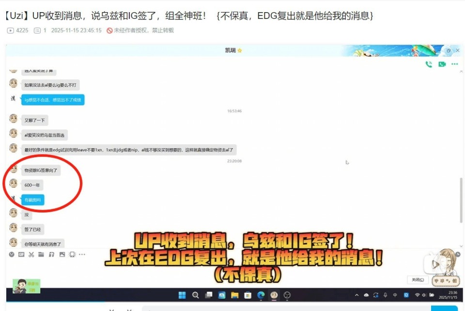 在详细内容中,澡酱的日常晒出了自己和知情人的对话,知情人明确表示:Uzi和IG签了意向,600万一年,16号就有消息了。