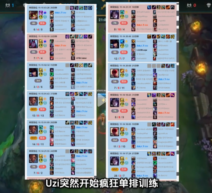一切始于Uzi突然开启的“疯狂单排模式”。这位久未征战赛场的传奇AD选手,竟在短时间内连续进行高强度训练,一天之内竟能完成十多把排位赛,其训练强度丝毫不逊于现役职业选手。这一反常举动立刻引发了网友们的热议,纷纷猜测Uzi是否正在为复出做准备。毕竟,对于一位已经退役的选手来说,如此高强度的训练绝非寻常之举。