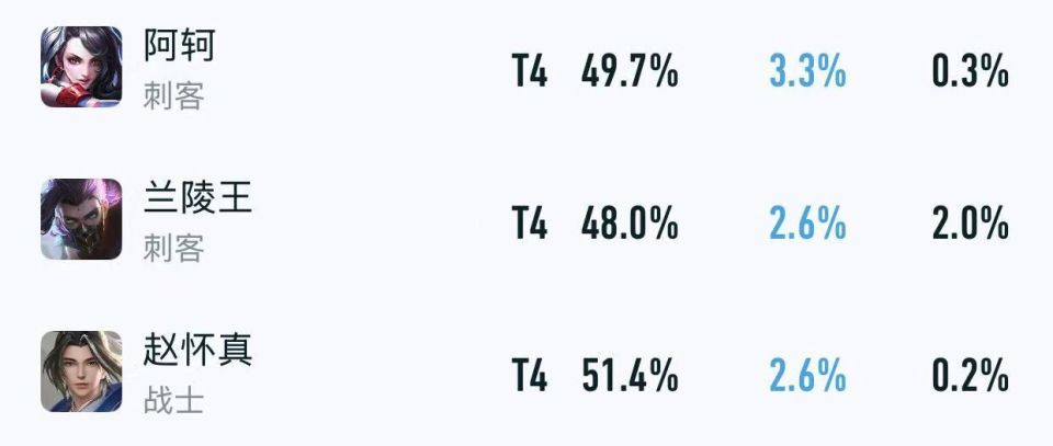 比如会被形昭血脉克制的兰陵王+阿轲,还有普攻会“罚站”的赵怀真,他们的巅峰赛出场率都是垫底中的垫底,甚至连绝活玩家都没剩多少了。