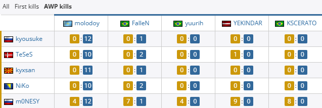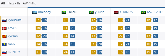在全部对位数据上,FURIA战队选手molodoy展示出了自己强大的威慑力,除了面对TeSeS(16-18)略居下风之外,剩下的Falcons选手都不能给molodoy带来太多压力。尤其是kyousuke和m0NESY两位枪男面对molodoy对位数据惨淡,NiKo也仅有14-16的对位数据。