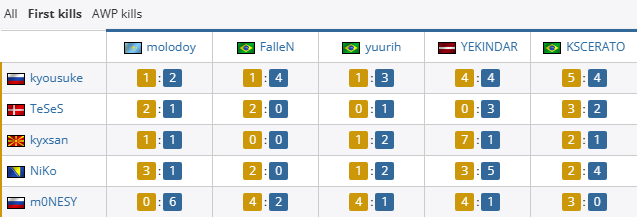 首杀对位数据上,YEKINDAR为队伍拿下14个首杀,molodoy和KSCERATO各拿下11个首杀。Falcons一方最多的首杀选手是m0NESY,为15个首杀。