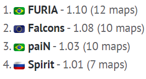 排名第一的是Falcons选手m0NESY,他在10张地图上有着1.42的rating;第二名JamYoung为6张地图1.32 rating;第三名donk为7图1.25。