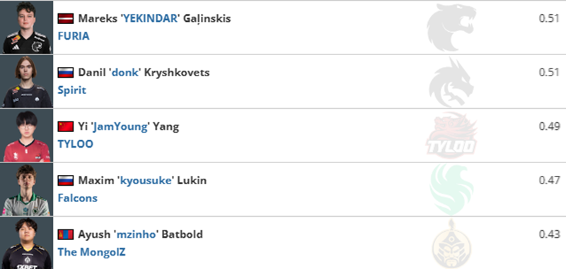 YEKINDAR以0.51的每回合爆头击杀为例第一;Spirit选手donk和YEKINDAR的数据一致,均为0.51;第三名是