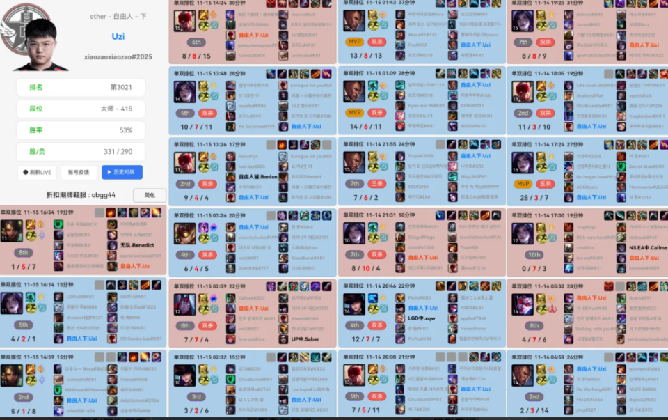 Uzi最近的Rank训练强度也似乎印证了复出的可能性。根据数据显示,Uzi近期在韩服进行了高强度排位训练,单日对局数量超过十场,甚至有一天从凌晨三点一直训练到凌晨五点半。