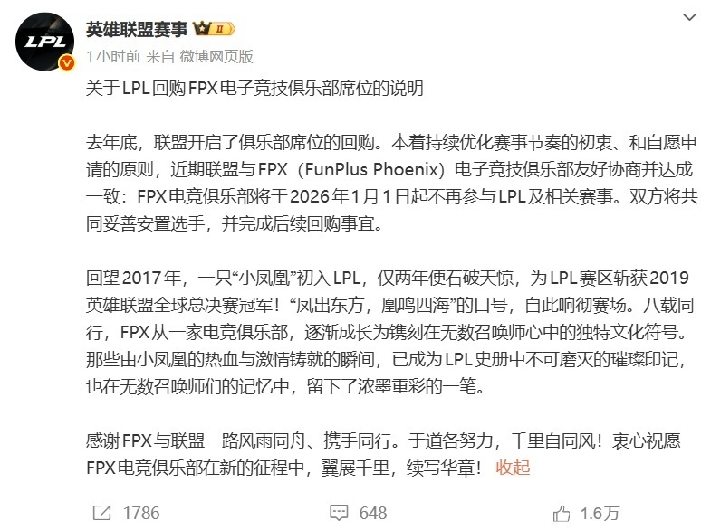 而今天,LPL官方是正式官宣了传奇战队FPX的退出。