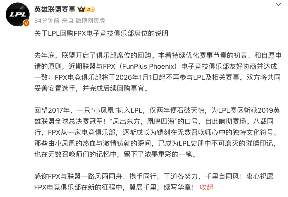 今日,英雄联盟赛事官方发布了《关于LPL回购FPX电子竞技俱乐部席位的说明》,说明中表示:本着持续优化赛事节奏的初衷、和自愿申请的原则,近期联盟与FPX(FunPlus Phoenix)电子竞技俱乐部友好协商并达成一致:FPX电竞俱乐部将于2026年1月1日起不再参与LPL及相关赛事。双方将共同妥善安置选手,并完成后续回购事宜。