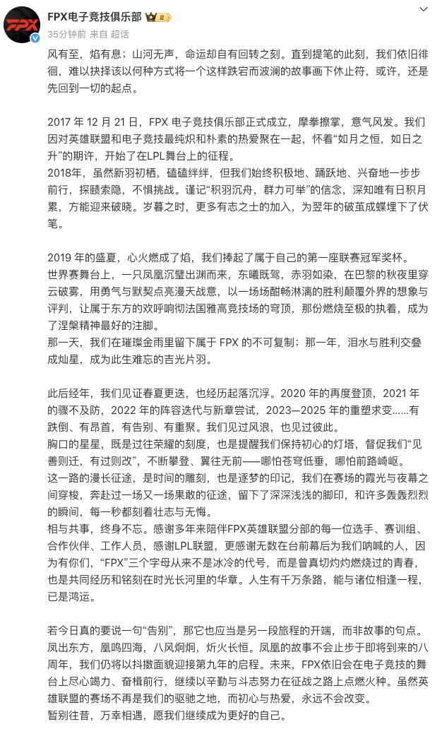LPL回购FPX电子竞技俱乐部席位,英雄联盟S9冠军发文告别