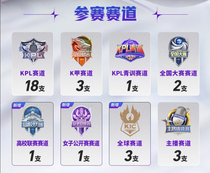 赛事体系由去年的五大赛道扩展为八大赛道,分别为(KPL、KGL、全国大赛、主播联赛、KPL青训、高校联赛、女子联赛、全球赛道),真正意义上实现了全维度的“挑战者赛事”体系。