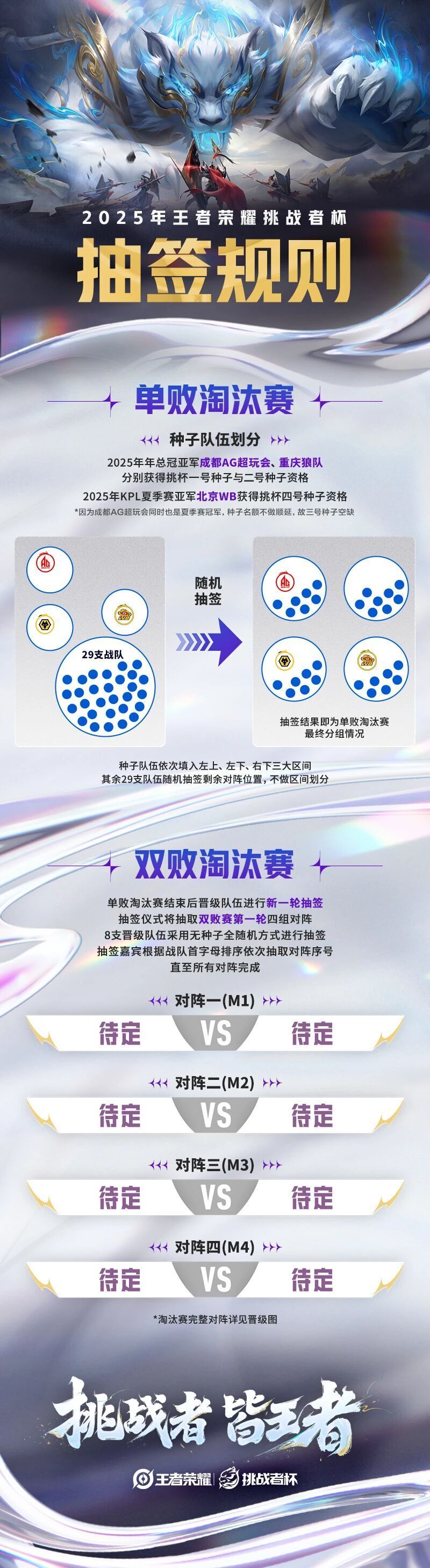 ✨2025年年总冠军成都AG超玩会、重庆狼队分别获得挑杯一号种子与二号种子资格,2025年KPL夏季赛亚军北京WB获得挑杯四号种子资格;