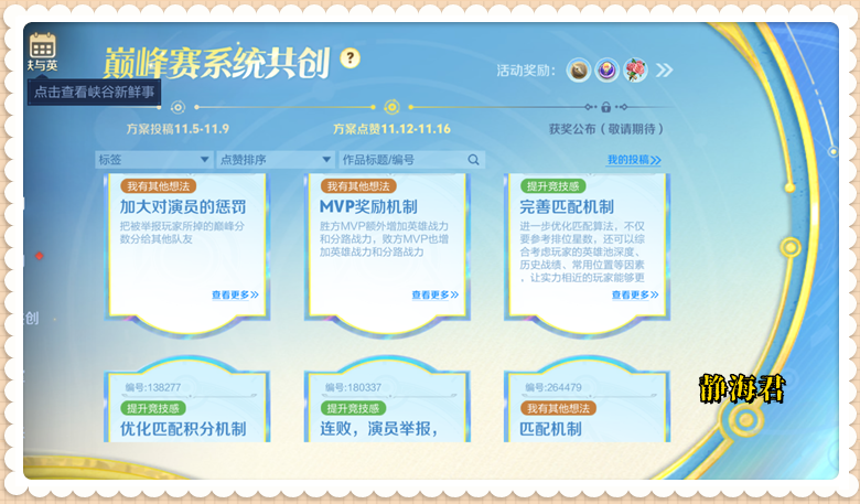 关于巅峰赛的共创已于11月16日完成了投稿、点赞,后续策划马上会确定获奖方案,并公布巅峰赛的具体调整。我个人猜测,关于巅峰赛的调整会在S41赛季末期或者S42赛季初期上线。