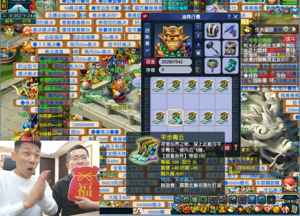 炼妖受挫后,宝哥转而鉴定100级装备。在奥运冠军明星玩家“石智勇”的见证下,他成功炸出【齐天大圣】服务器第一双“笑里藏刀”鞋子,瞬间吸引多位神豪关注,队友宝儿姐更是立即刷礼预定。