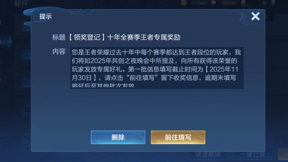 如上图所示,这是一位玩家分享的自己收到的邮件,这位玩家就是10年全部赛季都是王者段位,因此明年上线的所有新皮肤,都会自动发放到这位玩家的账号里面。