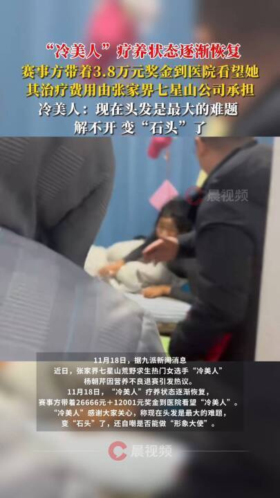 11月18日,“冷美人”疗养状态逐渐恢复,赛事方带着26666元+12001元奖金到医院看望“冷美人”。“冷美人”感谢大家关心,称现在头发是最大的难题,变“石头”了,还自嘲是否能做“形象大使”。