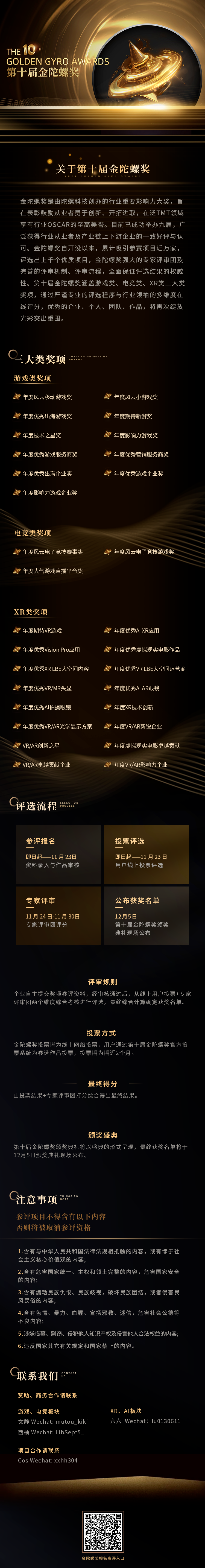 奋进十载,启序新章。第十届金陀螺奖共设立游戏类、电竞类和XR类三大奖项,共计30个细分类目,旨在表彰和铭记在行业中勇毅前行的领航者,创新进取的从业者们!