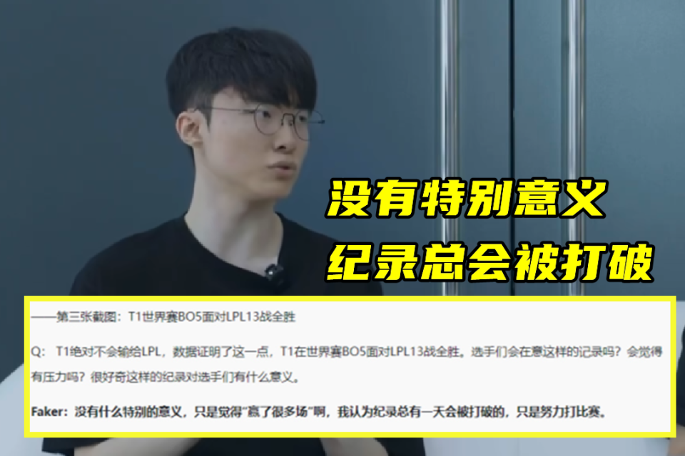 Faker:没有什么特别的意义,只是觉得赢了很多场,我认为纪录总有一天会被打破,只是努力打比赛。对此,有玩家调侃Faker已经为若干年后,自己输给T1铺好了台阶,这样输了也不会尴尬。但说实话,如果LPL打破这项纪录之时,面对的是年老的Faker,击败一位下山的神,这种纪录被打破也不会有什么成就感。但话又说回来了,巅峰时期的Faker,现在LPL想打败还真就希望不大。