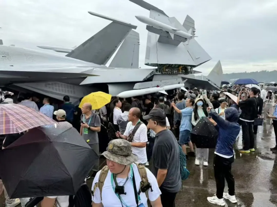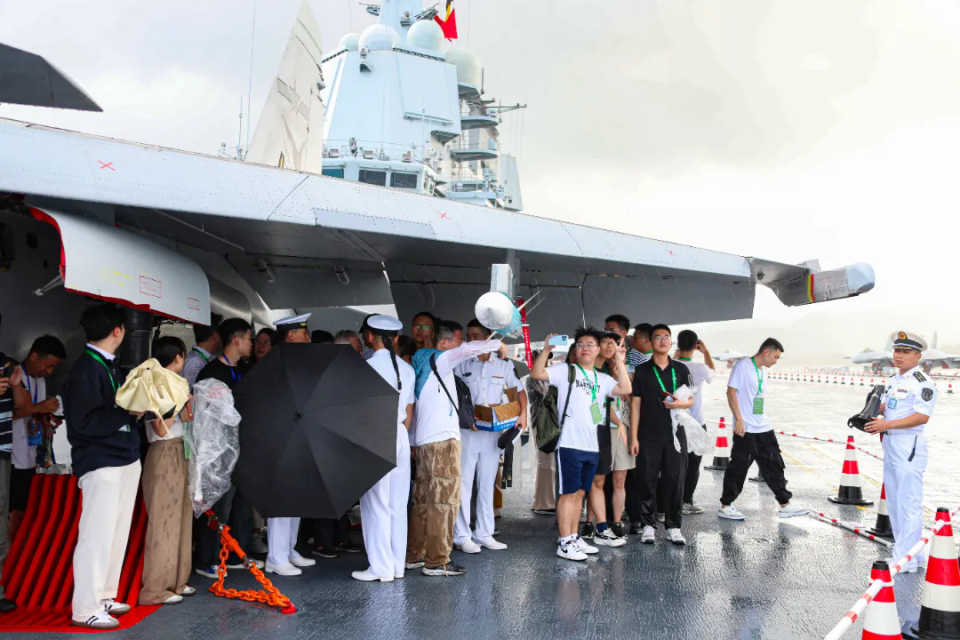 2024年11月13日,中国航展期间,歼15T“珠海”撑伞,为民众遮风蔽雨;2025年7月5日,山东舰开放期间,歼15T再次成为避风港。