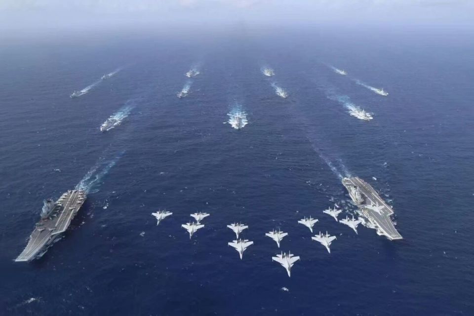 2024年10月,辽宁舰、山东舰编队在南海某海域首次开展双航母编队演练。歼15编队飞越双航母编队上空,展示了人民海军强大的海上作战能力与协同作战水平。