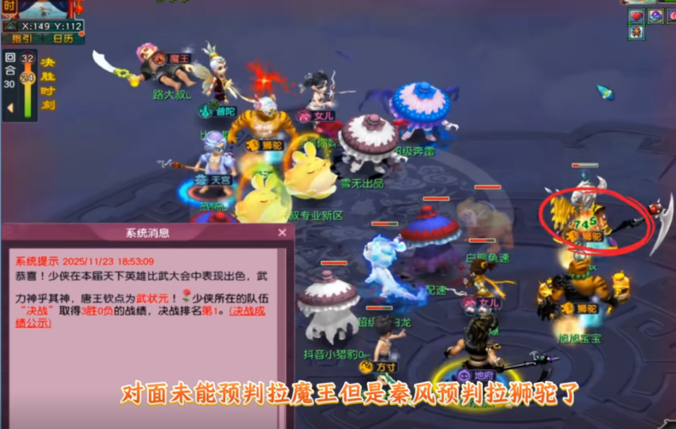 最终,宝哥不负众望,一举夺下“齐天大圣英雄大会”的桂冠!但这场胜利来得并不轻松——决赛中,宝哥的狮驼岭几乎每回合都被对方天宫牢牢封印,场面一度陷入胶着。直到第30回合,秦风果断点倒对面魔王,而对方也同时击倒了秦风的狮驼。千钧一发之际,对方未能预判复活魔王,而秦风却精准预判并拉起狮驼——系统最终判定宝哥队伍获胜,荣膺“武状元”!