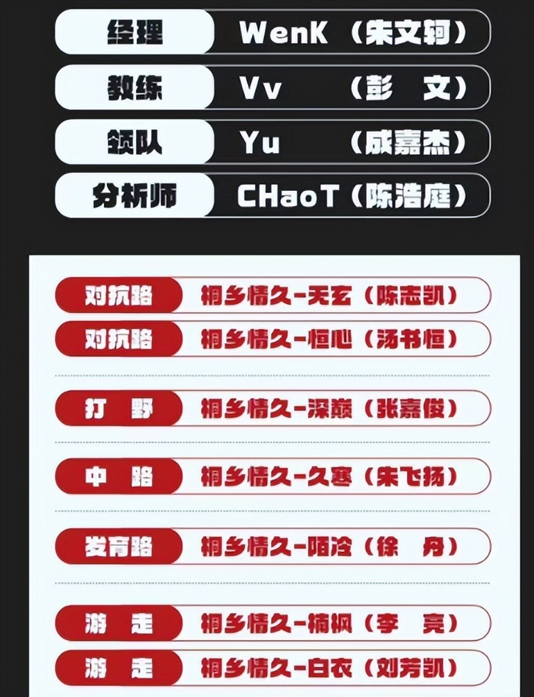 情久这次五人组没有整整齐齐了,打野换成了深巅,辅助换成了楠枫,边路风行退役换成无玄。相比于磨合默契的五人组,新的阵容需要一定磨合的时间,而且这些选手的实力看上去也没有很强,晋级八强的机会不大。