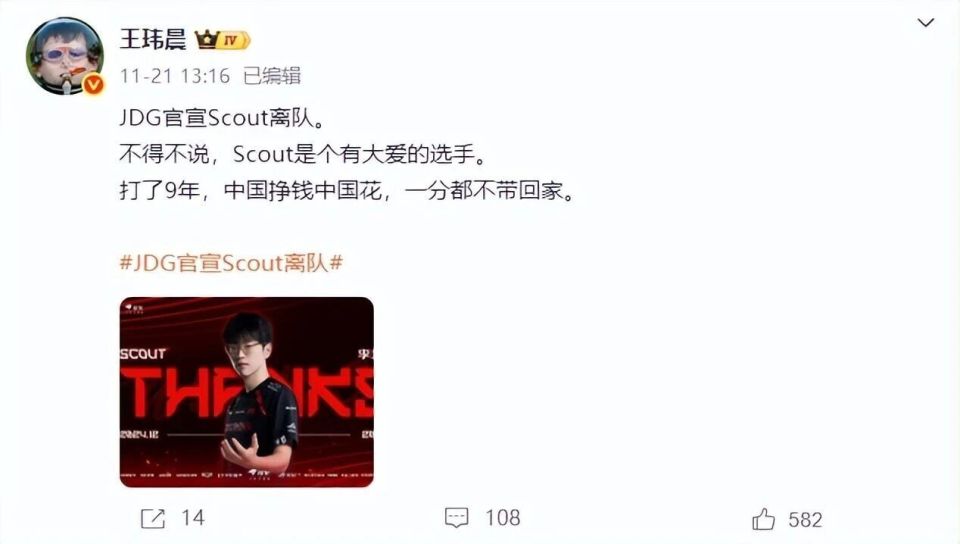 各位观众老爷们大家好啊,说起Scout这名选手,这两年关于他的消息几乎都没什么正面的新闻了,不是欠债就是违约,而就在最近,JDG战队也是宣布和scout选手和平分手,scout选手也是回到了LCK赛区并加入了NS战队,但是曾经的一条采访消息也是很快被翻了出来。