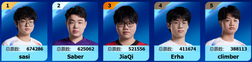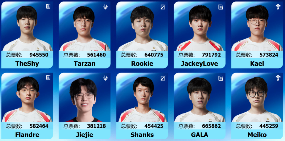 TheShy以94万票成为“票王”,将第6次获得年度最受欢迎选手。全明星阵容首发,因为一支队伍不能超过3个人,所以Meiko和Shanks的位置都要顺延,如果没有选手不去全明星的话,最终首发如下。TheShy,Tarzan,Rookie,JKL,KaelFlandre,Jiejie,Xiaohu,Gala,Crisp但队伍还没定,需要由TheShy和JKL两位队长选人。Sasi,Climber,Saber,JiaQi,Erha