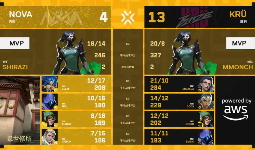 在上半场巨大落后的情况下,NOVA必须在下半场一口拿到连胜才能扳回局势。但KRU在下半场赢下图二的手枪局后,几乎粉碎NOVA翻盘希望,尽管对手在eco局勉强扳回两分,但上半场的巨大分差已成定局。最终KRU以13-4轻取对手,总比分2-0完成晋级。