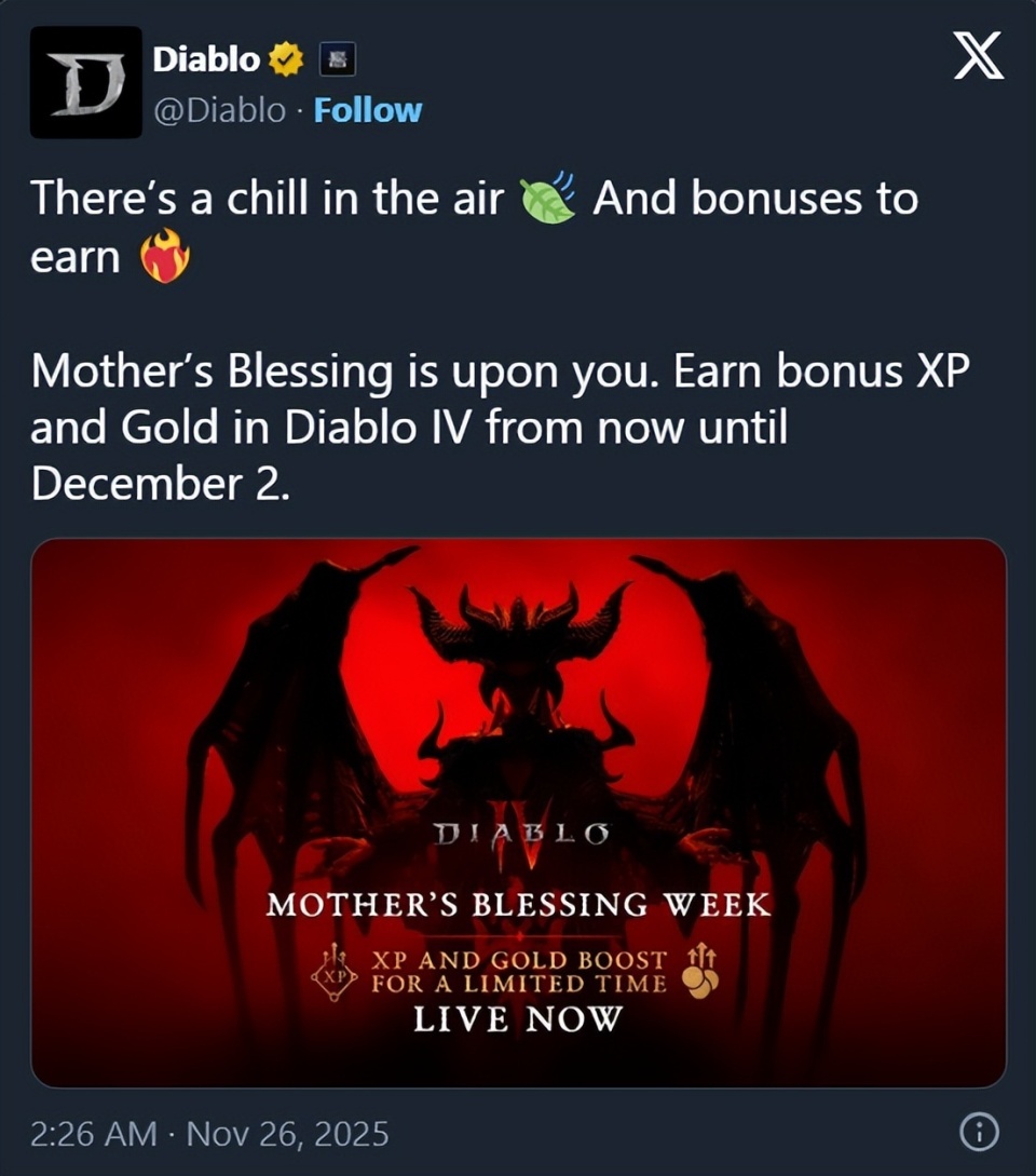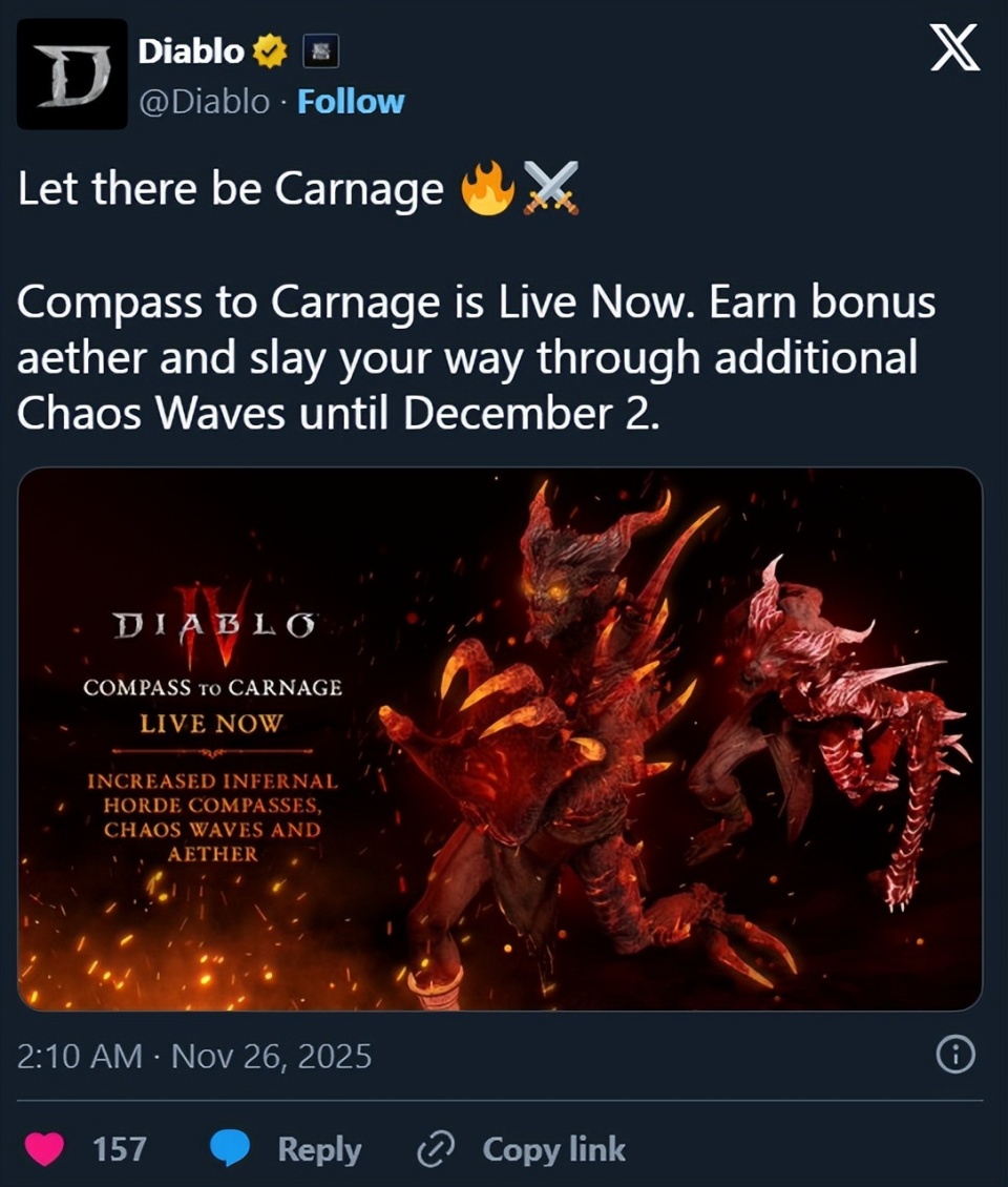 11月26日消息,暗黑官推宣布两项全新活动:“屠戮罗盘”(Compass to Carnage)和“圣母的恩赐”(Mother’s Blessing)已上线,这次活动将持续到12月2日,为S10的收官划上完美句号。